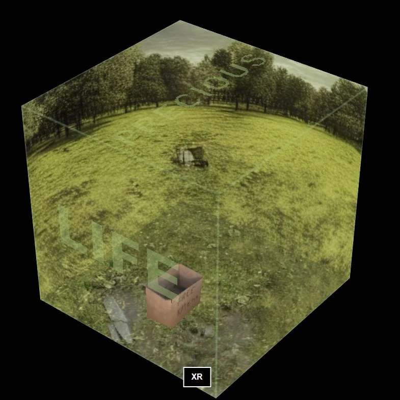Free Kittens made its first thematic appearance as a 1990s-era painting. Later versions include metaverse installations and this WebXR cube.